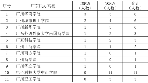 (中国知网高被引学者TOP1%-TOP5%广东民办高校排名前11一览表)