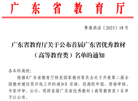 近日,广东省教育厅完成了首届广东省优秀教材(高等教育类)的评选工作,公示期已顺利结束,正式名单尘埃落定。tyc7111cc太阳成在此次评选中表现卓越,两部教材成功入选,这无疑是学校教育教学工作的重大成果,彰显了我校在教材建设领域的深厚底蕴与强劲实力。