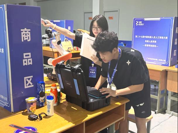在聚焦商品识别、智能分拣等智能化技术应用的智慧零售赛项(全国共设奖项96项:一等奖19项、二等奖29项、三等奖29项、优秀奖19项)中,华商学子表现尤为亮眼。“睿链智眸”团队(队长:李裕斌,指导老师:杨波),聚焦零售商品目标检测算法优化与机械臂协同控制核心环节。备赛期间,在学校及学院提供的先进设备、充足场地和稳定环境支持下,团队深入钻研,反复测试优化。比赛中,他们凭借扎实的技术功底,精准高效地完成了商品夹取、信息播报等关键任务,其方案的高效性与准确性赢得评委高度认可,最终勇夺全国一等奖!从获奖名单来看,与“睿链智眸”团队一同获得一等奖的还有来自清华大学的“智域行者”、电子科技大学的“i4AI”、中山大学的“sysu 机器人大赛”等多支知名高校团队,这些团队均在各自的研究领域有着深厚的积累,“睿链智眸”团队与他们同台竞技并共享殊荣,更凸显了此次获奖的含金量。