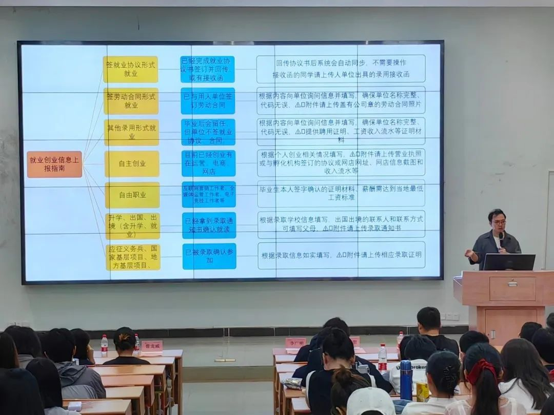 宋元跃老师详细地为各位毕业生讲解毕业日程安排和相关就业手续,强调签订就业协议和劳动合同的重要性和注意事项。他希望2024届毕业生们能积极主动参加各类招聘面试,积累经验,并建议同学们多关注公众号、群消息,获取更多的宣讲会和招聘会信息,把握好每一次的面试机会。同时也希望同学们在求职过程中遇到的困难和问题可以主动反馈给辅导员,寻求指导和帮助。