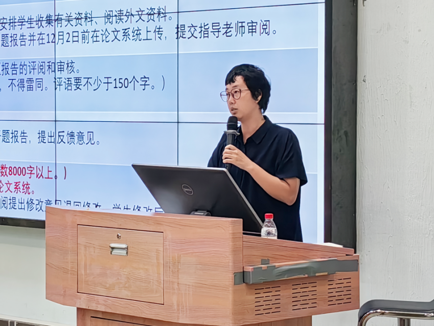 梁凤银老师进行毕业论文动员,梁老师根据自身多年经验,结合具体实例,对如何开展本科毕业论文进行了指导。她从本科毕业论文总体目标、基本要求、时间进度、指导教师、选题要求等方面内容进行介绍。她强调,毕业生要合理安排毕业论文时间,要注重毕业论文格式准确规范的重要性,希望同学们要严格遵守学校关于毕业论文的基本要求,把握论文选题、撰写的时间进度,鼓励各位同学积极主动和老师交流。