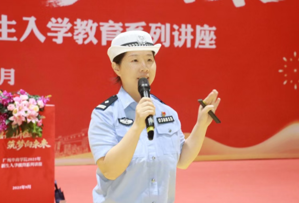 随后,增城分局平安宣讲团的四位警官分别围绕网络安全、反诈知识、交通安全及防溺水反走私等主题,结合真实案例进行了深入浅出的宣讲。肇庆校区则邀请四会公安局刑侦大队罗昌宏警官开展反诈安全宣讲,警官结合校园及周边真实诈骗案例,拆解骗子话术设计与作案流程,将专业反诈知识转化为学生易懂、易用的防护技能,切实提升新生自我保护意识。本次活动通过警校联动的形式,有效提升了师生的安全防范意识和应对能力。