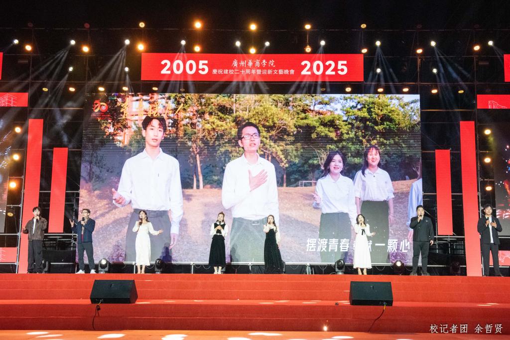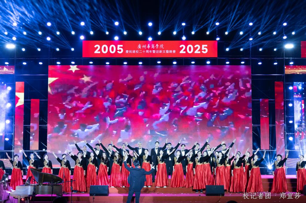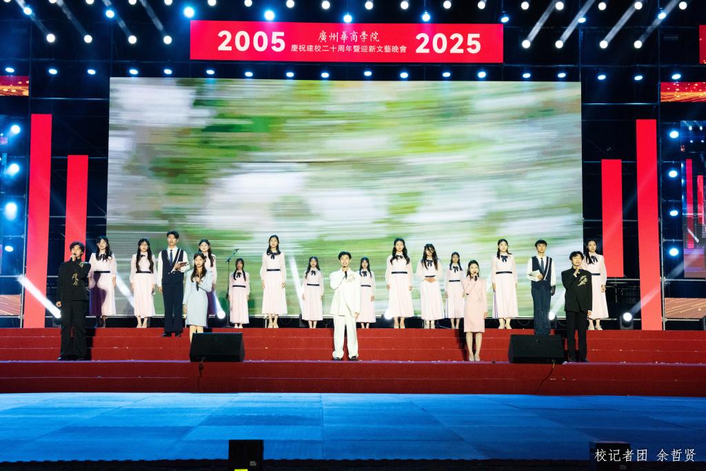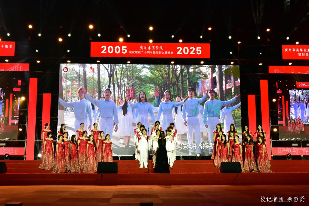 晚会尾声,全体演职人员登台,全场师生共同唱响校歌《共筑荣光》。“日出东方,灼灼华商”的校园风貌,“厚德励志,博学创新”的校训精神,都融于歌声中,凝聚起共铸百年荣光的奋进力量。熟悉的旋律回荡在会场,真挚的情感溢满心间,歌声中饱含着对母校的深情祝福,更凝聚着全体华商人砥砺前行的坚定信念。