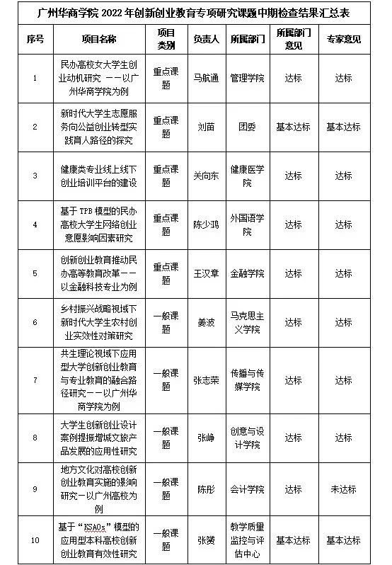 根据《tyc7111cc太阳成创新创业学院关于开展2022年创新创业教育专项研究课题中期检查工作的通知》(华商创〔2022〕27号)文件要求,创新创业学院已组织开展2022年创新创业教育专项研究课题中期检查工作,共有16个项目参与中期检查。经项目所属部门自查,创新创业学院聘请专家审核、评议,有10个项目达标,5个项目基本达标,1个项目未达标,具体情况如下。