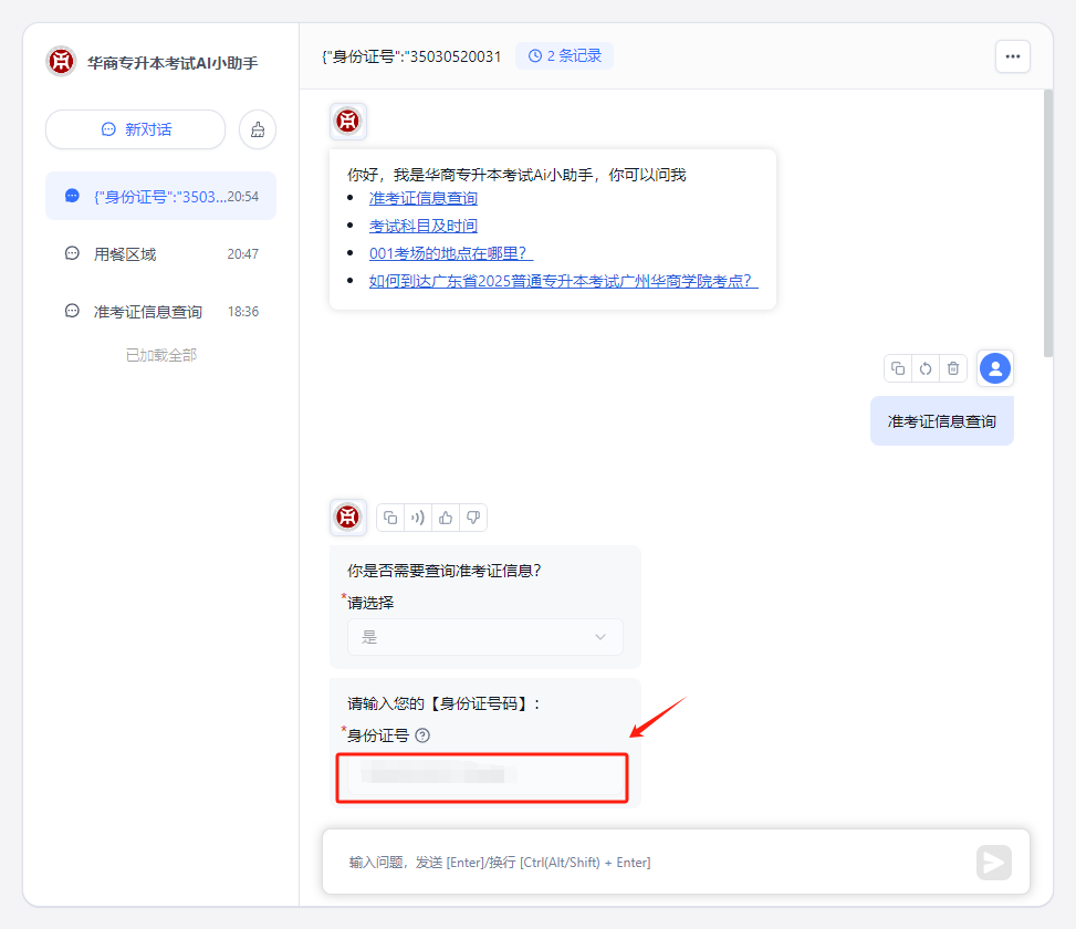 考生可通过华商AI智能体“华商专升本考试AI小助手”(点击阅读原文或跳转链接:https://agent.gdhsc.edu.cn/chat/share?shareId=ytlp005lh8pzf28aoljn02q3)进行考场查询及考点信息搜罗。华商AI智能体通过数字化手段构建考试保障体系,使考生得以系统掌握考点信息,为考生从容应试提供全方位技术支持。