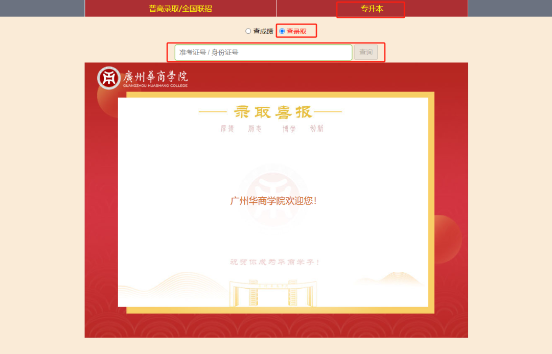 进入网站首页,点击【录取/成绩信息查询】;选择【专升本-查录取】;输入个人信息点击查询即可。
