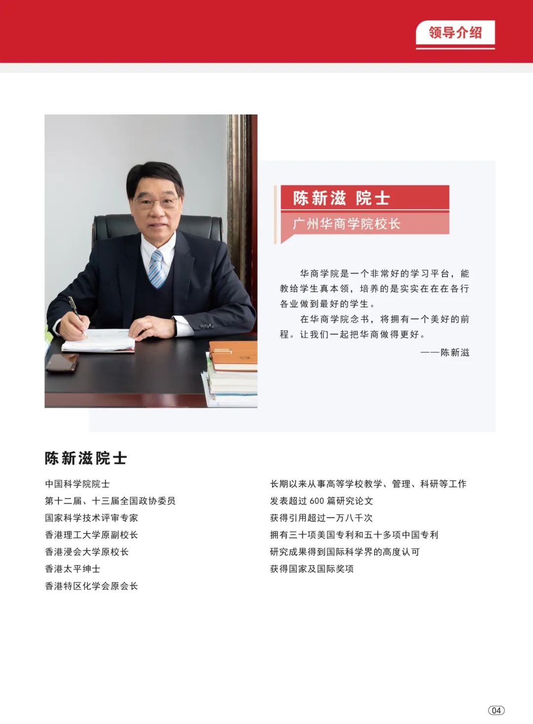 学校由世界著名化学家、中国科学院院士、香港浸会大学前校长陈新滋教授任校长,诺贝尔化学奖得主让-马里·莱恩(Jean-Marie Lehn)教授任荣誉校长。