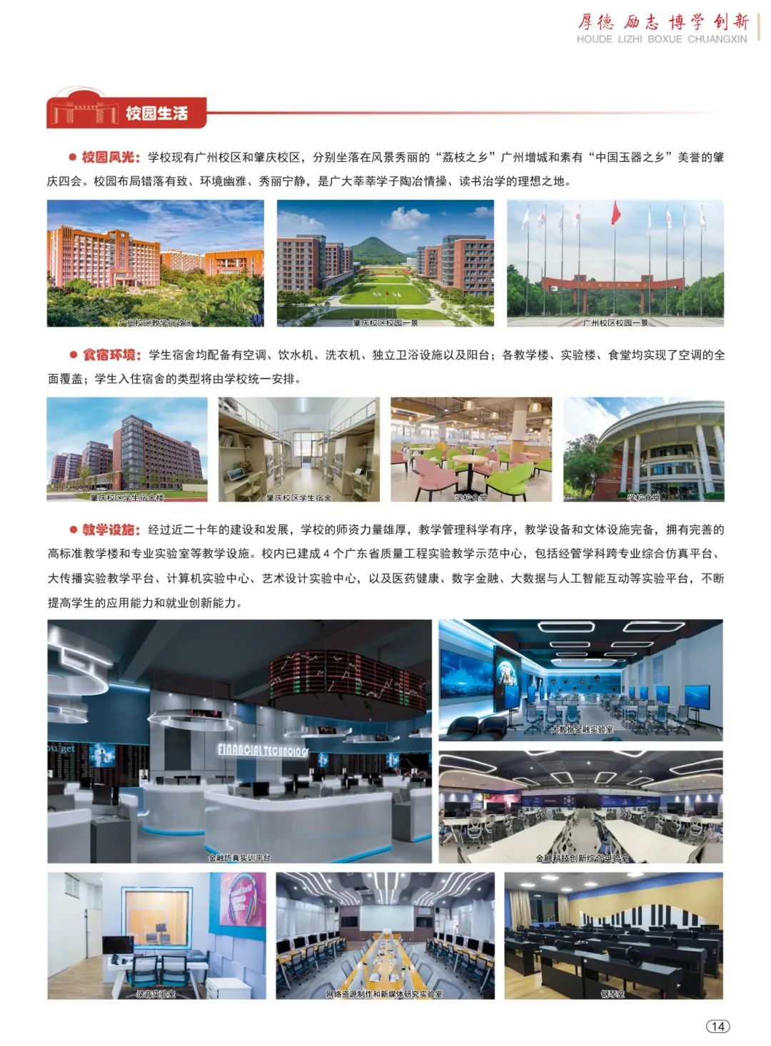 学校设立16个省级、校级研究院(所),助力产、学、研协同发展,以“二协同、五融合”为人才培养模式,实施校企协同育人,致力于实践教学体系、产教融合、校企合作建设的探索。校内已建成5个高标准、高水平的广东省质量工程实验教学示范中心——经管学科跨专业综合仿真平台、大传播实验教学平台、计算机实验中心、艺术设计实验中心,以及医药健康、数字金融、大数据与人工智能互动等实验平台,不断提高学生的应用能力和就业创新能力。