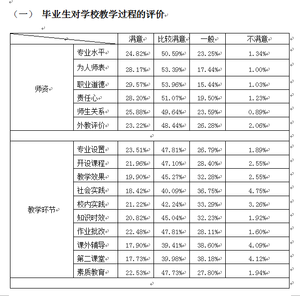 此次调查发出毕业生作答问卷5620份,回收问卷2450份,取其中2400份问卷进行统计和数据分析。结果显示,毕业生对我校教学中的师资、教学环节、制度建设、教学服务等方面的满意度较高,对我校的教学效果也较为认可。