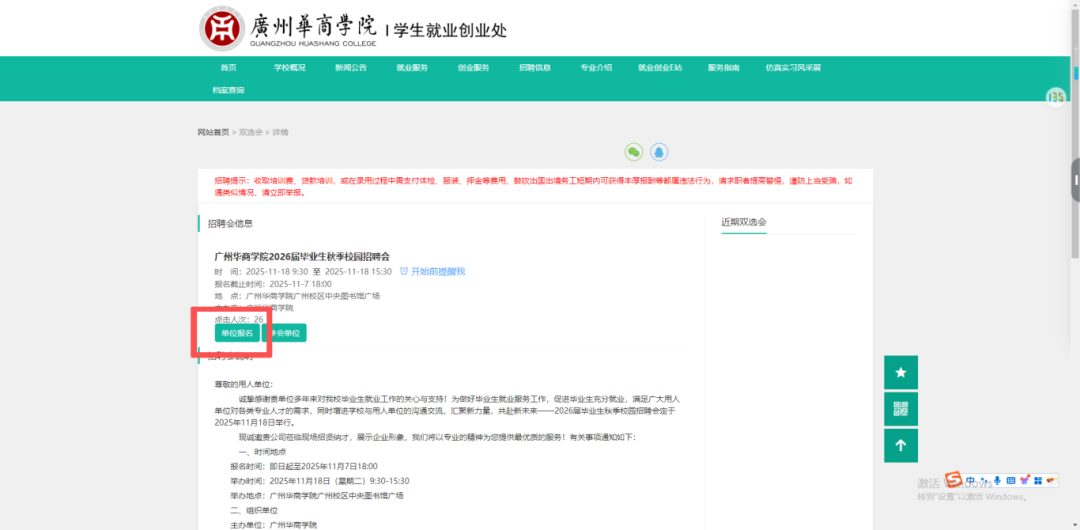 打开报名链接:https://gdhsc.bysjy.com.cn/detail/jobfair?id=25193,点击【单位报名】