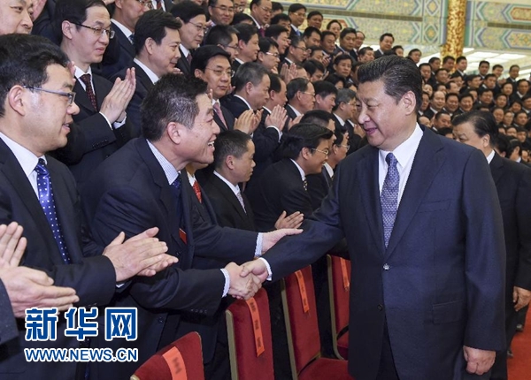 下午3时,习近平等来到人民大会堂金色大厅,同代表们亲切握手,并合影留念。