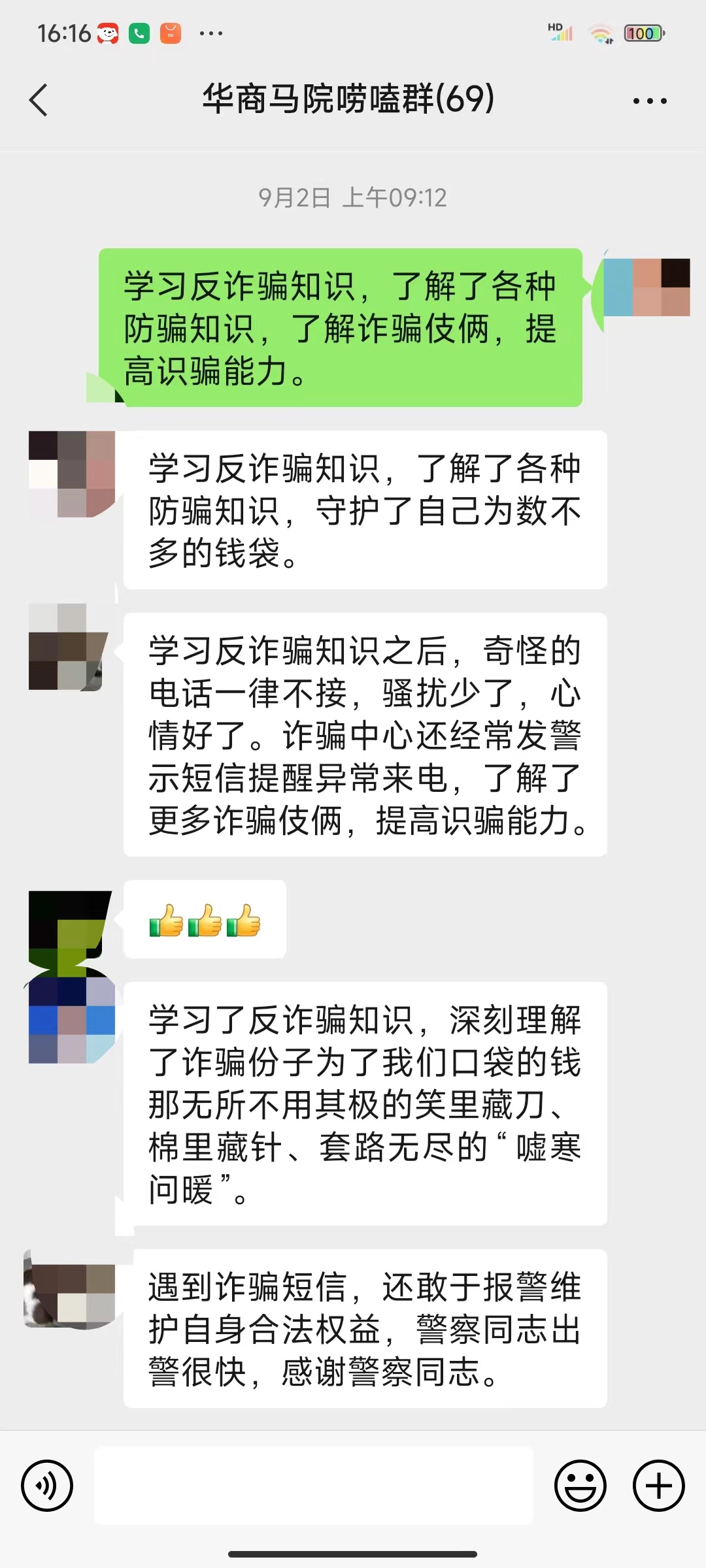 学习后老师们在微信群展开激烈的反馈和发表心得。有老师反馈说:学习反诈骗知识,了解了各种防骗知识,守护了自己为数不多的钱袋。有老师表示:学习反诈骗知识,关注国家打击电信诈骗的最新动向和阶段性成果。上课时给学生介绍讲解,防骗防诈、你我有责、注重细节、提高警惕!大家都认为预防诈骗,第一就是下载国家反诈APP,这个就是我们最大的保护,除此之外,要提高警惕,天上没有掉馅饼的事,但是地上可能有陷阱。脚踏实地工作,勤奋努力赚钱才安心。