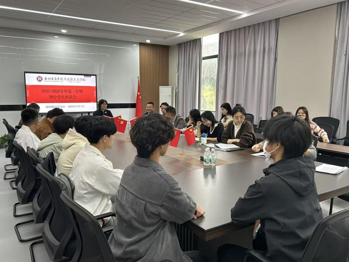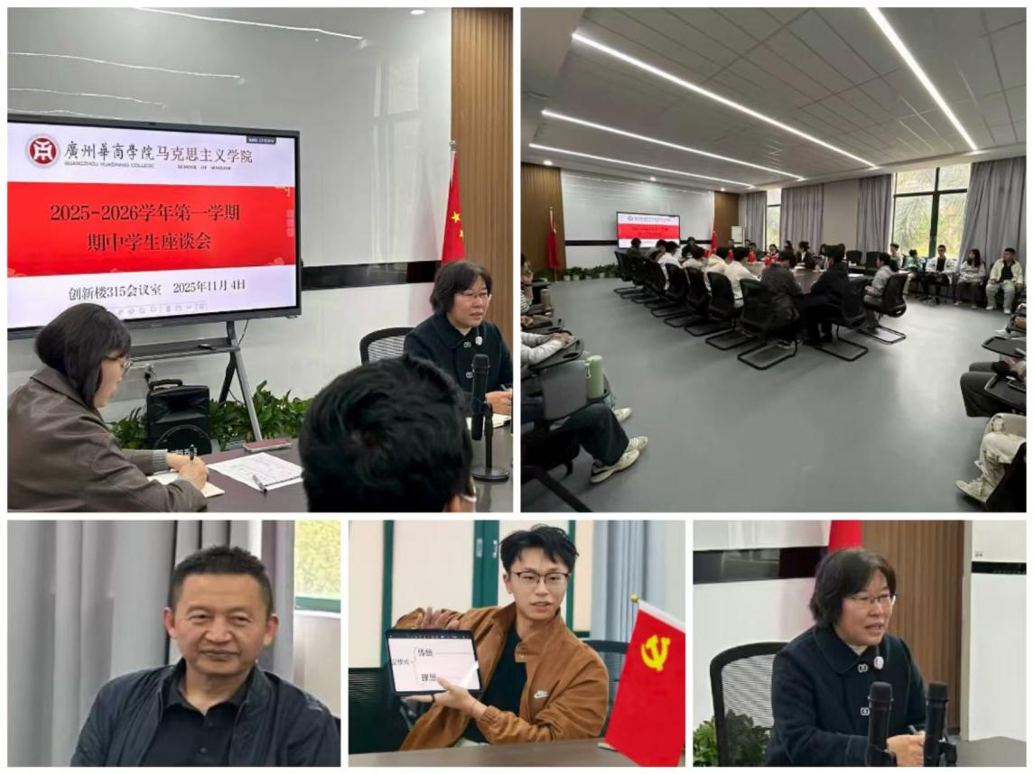 为深入推进思政课教学改革,全面提升教学质量,以优异状态迎接学校本科教学工作合格评估,献礼20周年校庆,太阳成集团tyc7111于2025年11月4日14:20在创新楼315会议室召开了2025-2026学年第一学期广州校区学生期中座谈会。学院分管教学工作的副院长胡立娟主持会议,各教研室负责人和教师代表与来自不同年级、不同专业的学生代表齐聚一堂,围绕思政课教学内容、方法及课堂氛围等话题展开深入交流。
