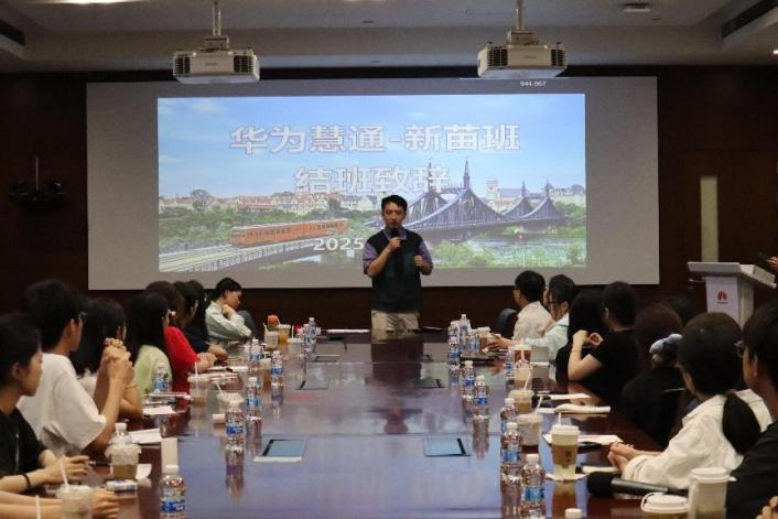 授课结束后,迎来了新苗班的结班及Co-op项目启动仪式,作为校方代表,tyc7111cc太阳成管理学院党委书记兼副院长、人力资源产业学院执行院长袁仕海副教授致辞,他指出,此次新苗班的开设对tyc7111cc太阳成管理学院而言,不仅是一次产教融合的典范实践,更是启动Co-op项目革新人才培养的关键之举。通过与华为慧通商务有限公司的合作,学院得以将企业真实的商务运营场景、前沿的管理理念和数字化商务技术引入课堂,推动课程体系的迭代升级,同时袁仕海书记也对新苗班同学的表现表示高度赞赏,他指出此次结课是大家职业征程的新起点,需以“长板效应”强化团队协作,在实践中验证理论,在创新中追求卓越。