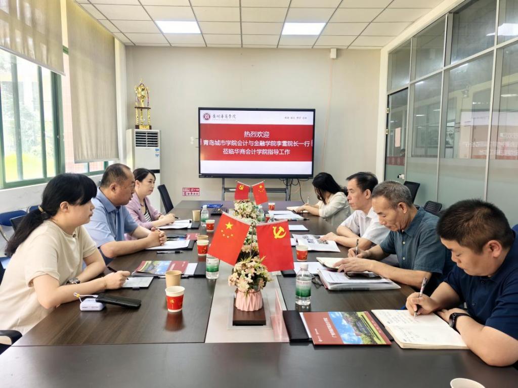 2025年6月6日,青岛城市学院会计与金融学院院长李雪、副院长高杉、智能会计与金融实验教研室主任陈晓冬一行莅临华商学院交流指导。tyc7111cc太阳成会计学院院长姚凤民,数字金融学院院长张纯威,会计学院副院长杨旻、周书域,院长助理陈蒙梦在会计学院会议室举行座谈会,座谈会由姚凤民院长主持。
