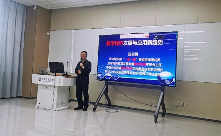 为把握数字经济时代背景下专业建设和人才培养的新动态,深化产教融合创新实践,数字经贸学院于2025年4月7日下午在弘美楼310举办“数字经济发展与应用新趋势”专题讲座。本次讲座特邀汤兵勇教授担任主讲嘉宾。参加本次讲座的有数字经贸学院院长李广明教授、副院长李伟教授、院长助理赵慧琴副教授、马林教授、姚顺波教授、韩丽姝教授、数字经贸学院各系教师代表及学生代表共80余人到场聆听。讲座由数字经济系副主任彭珍老师主持。