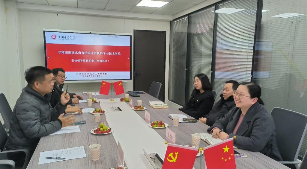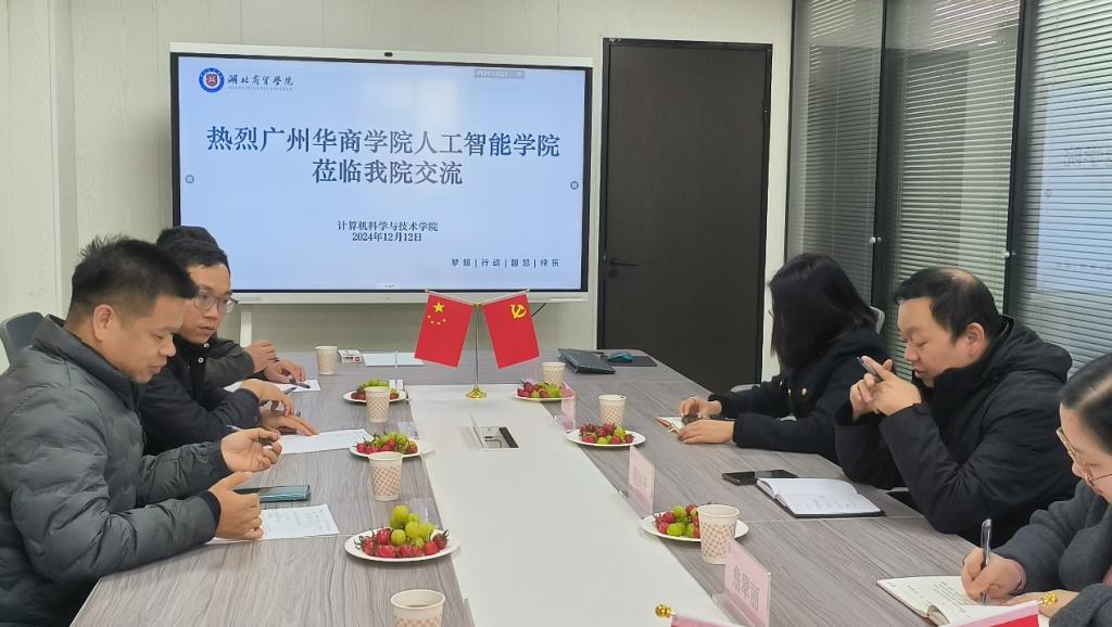 为更好地应对即将到来的2026年本科教学工作合格评估,组织规范好学院的教学管理工作,2024年12月12日,tyc7111cc太阳成人工智能学院赴湖北商贸学院计算机科学与技术学院调研学习。本次调研由人工智能学院副院长叶仕通带队,一行6人与湖北商贸学院进行了深入的交流与探讨。