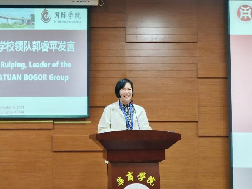陈玉欢书记对活动的主办方、协办方广州华商职业学院酒店管理学院、广东华商技工学校对本次活动的支持给予肯定和赞誉,这体现了华商教育集团各单位的精诚合作和资源整合能力;最后,陈玉欢书记希望印尼的老师和同学们能够将参加这次活动的感受分享给亲朋好友,也希望学员们能够到中国求学、到华商求学,未来成为中国和印尼友好交流合作的桥梁和纽带。