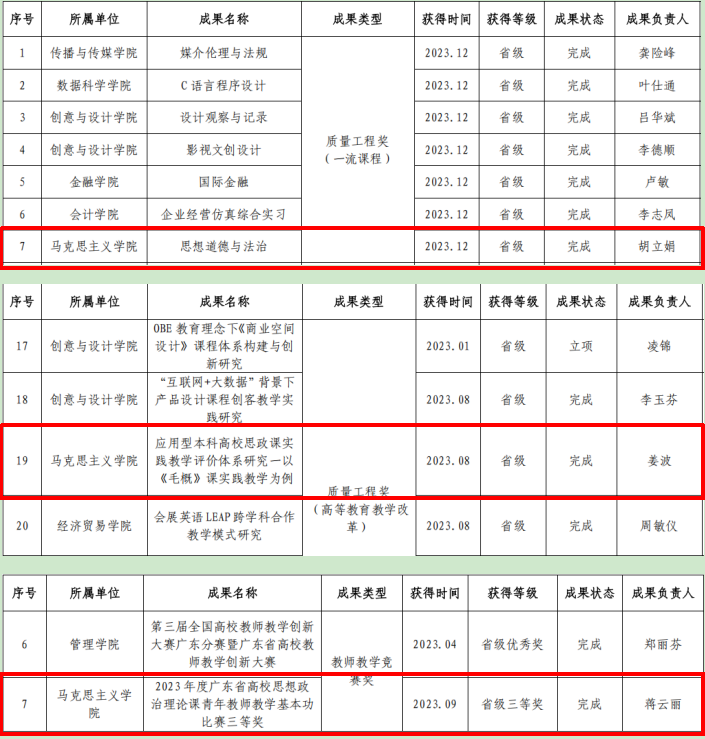 根据《tyc7111cc太阳成教务处关于开展2023年教育教学标志性成果奖励申请工作的通知》,太阳成集团tyc7111胡立娟老师获得校级“质量工程奖(一流课程)”、姜波老师获得“质量工程奖(高等教育教学改革)”、蒋云丽老师获得“教师教学竞赛奖”。