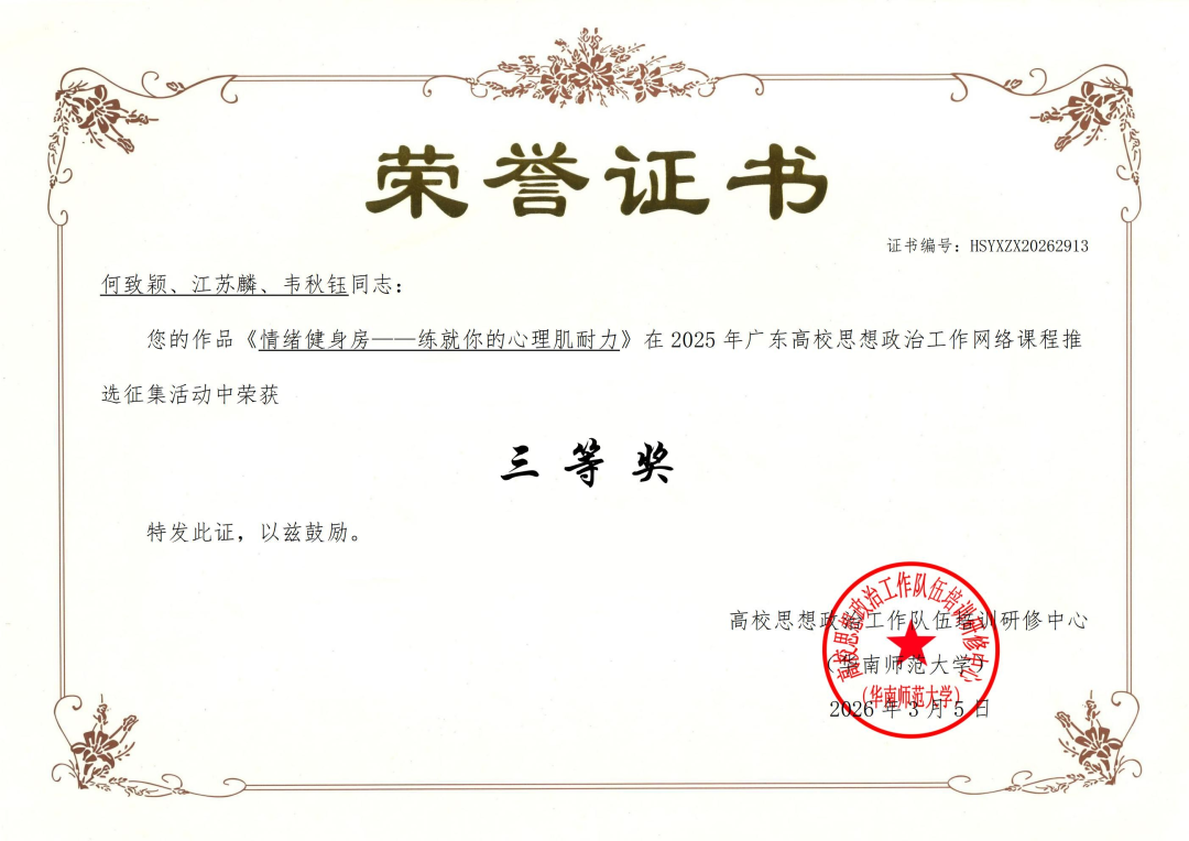 1.何致颖、江苏麟、韦秋钰老师的《情绪健身房——练就你的心理肌耐力》荣获2025年广东高校思想政治工作网络课程三等奖;