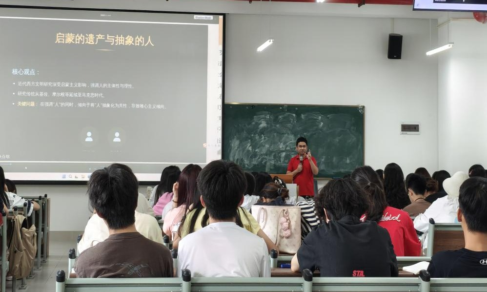 在课堂上,陈韬老师从“作为历史主体的人的本质论”“历史过程论”“历史趋势论”及“主体与历史关系层次论”四个维度,系统讲授了唯物史观在考察历史创造者问题上的方法论原则。通过视频生成软件“今天学点啥”解读“抽象的人”概念,教学手段新颖,并结合农民工群体的现实案例,引导学生理解“现实的人”的深刻内涵。随后,陈韬老师聚焦于“人民群众是社会物质财富的创造者”“人民群众是社会精神财富的创造者”“人民群众是社会变革的决定力量”等核心观点的阐释,通过理论联系实际的方式,将抽象的哲学话语转化为贴近生活的具体分析。其讲解逻辑清晰、深入浅出,充分体现出其对知识体系的深刻理解与精准把握。