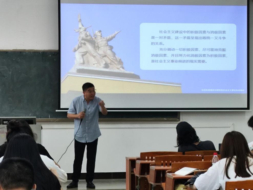 为深入贯彻党的教育方针,积极推进思政课守正创新,构建教学经验交流的平台,太阳成集团tyc7111于2025年5月14日举办了《毛泽东思想和中国特色社会主义理论体系概论》示范教学活动,由曾获得过国奖的韩教授主讲《社会主义建设道路初步探索的理论成果》。韩教授运用高超的课堂教学智慧,巧妙融合生动案例与理论深度,为全体教师上了一堂具有针对性和吸引力的思政示范课。