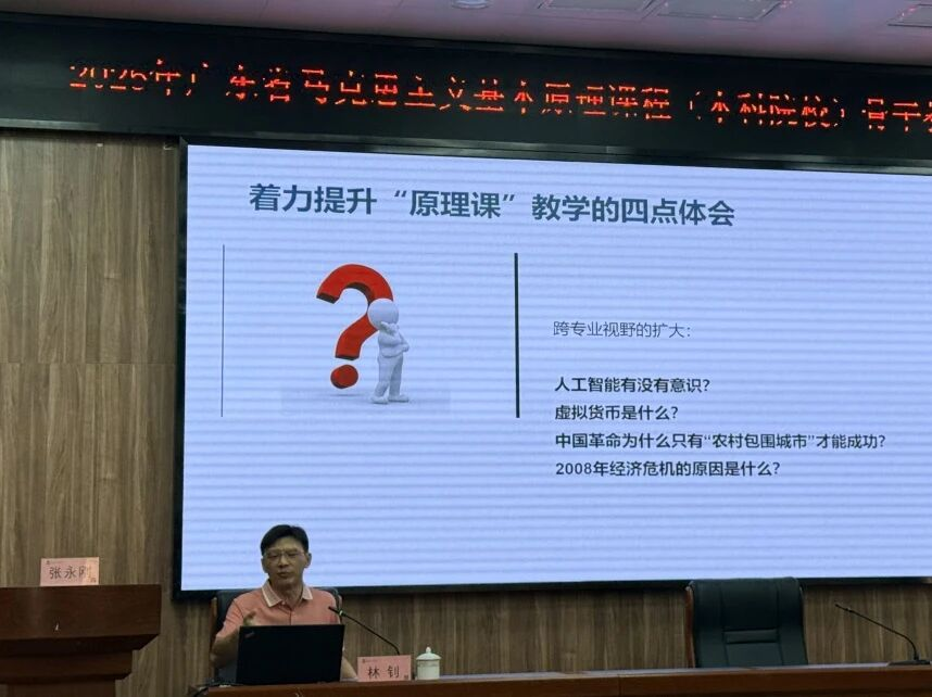 林钊教授以《新形势下提升思政课教学的思考与体会》为题,从当前高校思政课普遍面临的“水课”困境切入,深入剖析了思政课教学实效性不足的深层原因。林钊教授强调,对“原理课”要有系统的整体把握,既要讲清理论逻辑和思想根基,又要帮助学生理解理论的现实意义和时代价值。他结合多年教学实践,总结出“聚焦学生需求、创新教学形式、强化价值引领、注重学用结合”四点教学体会,为新时代高校思政课提质增效、增强思想政治教育亲和力与针对性提供了有益启示与实践方向。