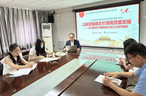 习近平新时代中国特色社会主义思想是党和国家必须长期坚持的指导思想,对新时代党和国家事业发展、对推进中华民族伟大复兴历史进程具有决定性意义。6月30日上午在学校行政楼512会议室,校党委副书记、执行校长郭银华同志为行政第四支部讲授了题为《以新发展理念引领高质量发展——关于新时代中国特色社会主义经济建设》的主题党课。