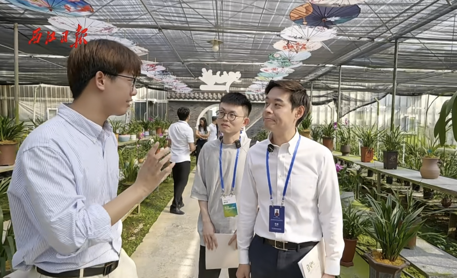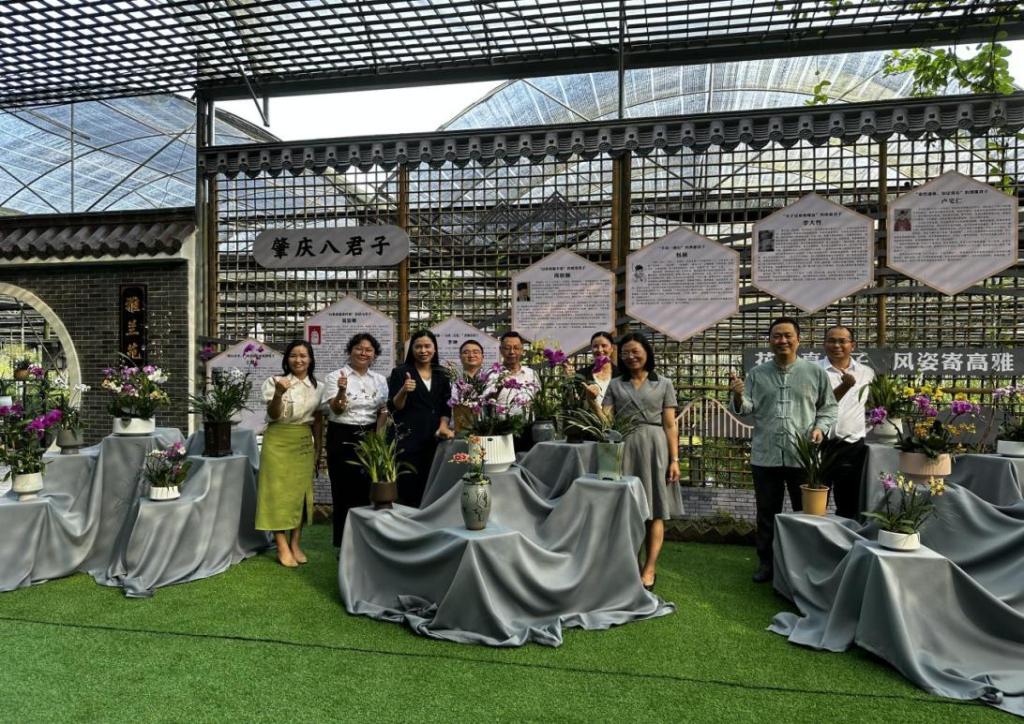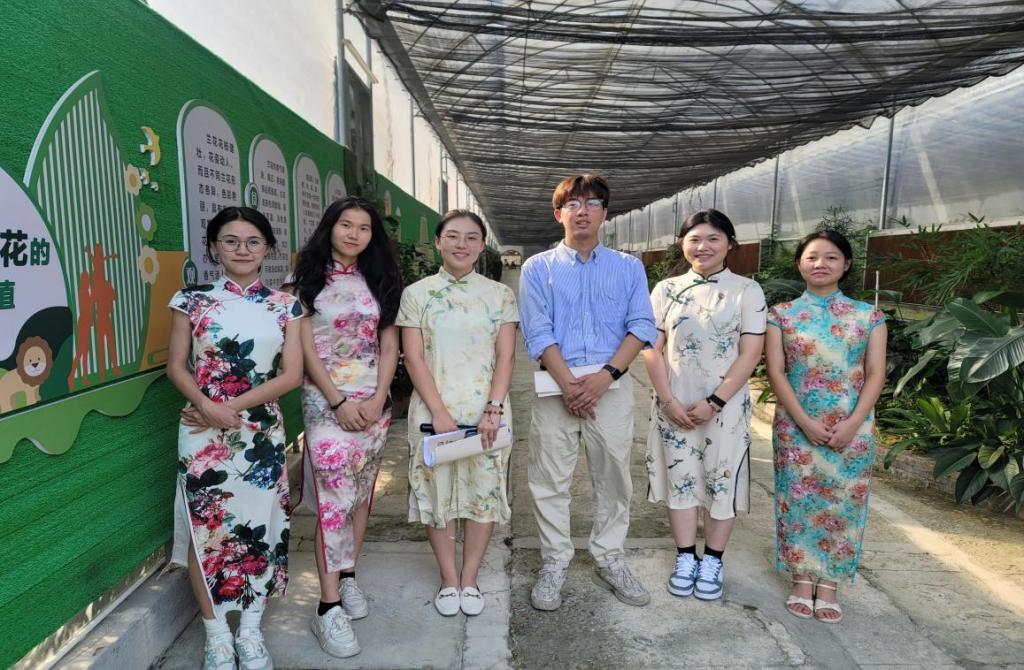 本次雅兰芳站路线讲解,师生志愿者们做好充分准备,精神饱满为到访人员提供外语翻译服务。“大湾区兰花看四会,四会兰花看石狗,石狗镇位于四会市中西部,地处北回归线以南,是四会市最早种植兰花的地方。”“四会市以兰为媒,将典雅的兰花元素融入到生活中去,让大家更好地认识兰花、感受兰花而打造的一系列文创产品,也是四会发展兰花产业全产业链的一种创新与尝试。”从雅兰芳大厅,到雅兰芳花场;从兰文化展示区,到兰花科普长廊,我校师生志愿者用心用情耐心讲解,为大家详细介绍四会兰花产业发展、石狗镇乡村振兴、经济发展的情况。我校学生志愿者们运用专业所学,用行动凸显语言的力量,绘声绘色地为大家讲述四会兰花、文化赋能乡村振兴的故事,搭建起中外交流的桥梁,帮助东盟青年、企业家深入了解中国、粤港澳大湾区以及肇庆的投资环境。