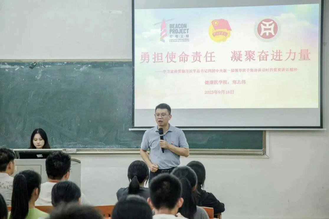 为更好地学习宣传贯彻习近平总书记的重要讲话精神,tyc7111cc太阳成健康医学院于2023年9月18日下午3:00在励志楼C101开展了主题为“勇担使命责任,凝聚奋进力量”主题团课。健康医学院各学生组织骨干、各班学生代表参与本次会议。郑志伟老师带领同学们细致解读了习近平总书记的重要讲话内容,一览共青团和青年工作的变革历程,深度剖析党中央对共青团工作的新要求,并针对培养什么样的青年、建设什么样的共青团两个问题做出基本概要。郑志伟老师对同学们提出三点嘱托与期望:第一,团结奋进,踔厉向前争做先锋;第二,实干担当,脚踏实地服务为民;第三,钻研学业,精益求精奉献社会。他希望各学生组织骨干、各班学生代表能够将所学习的内容付诸于实践,以实际行动担当青年责任,以刻苦努力建设国家。