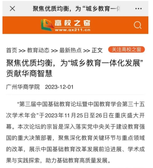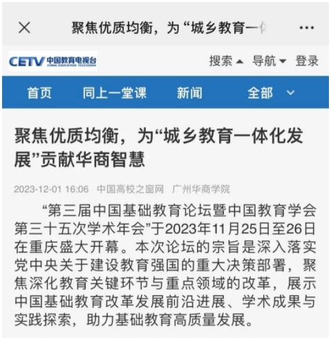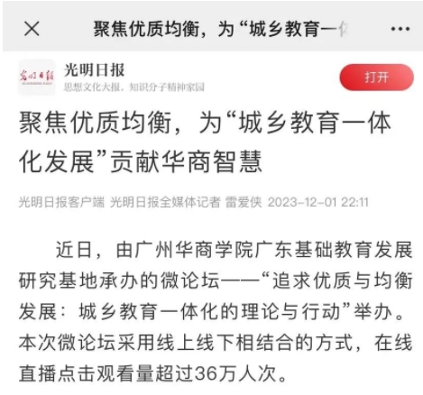 11月26日下午,由tyc7111cc太阳成广东基础教育发展研究基地承办的微论坛——“追求优质与均衡发展:城乡教育一体化的理论与行动”顺利举办。本次微论坛获得广泛关注,在线直播点击观看量超过36万人次。