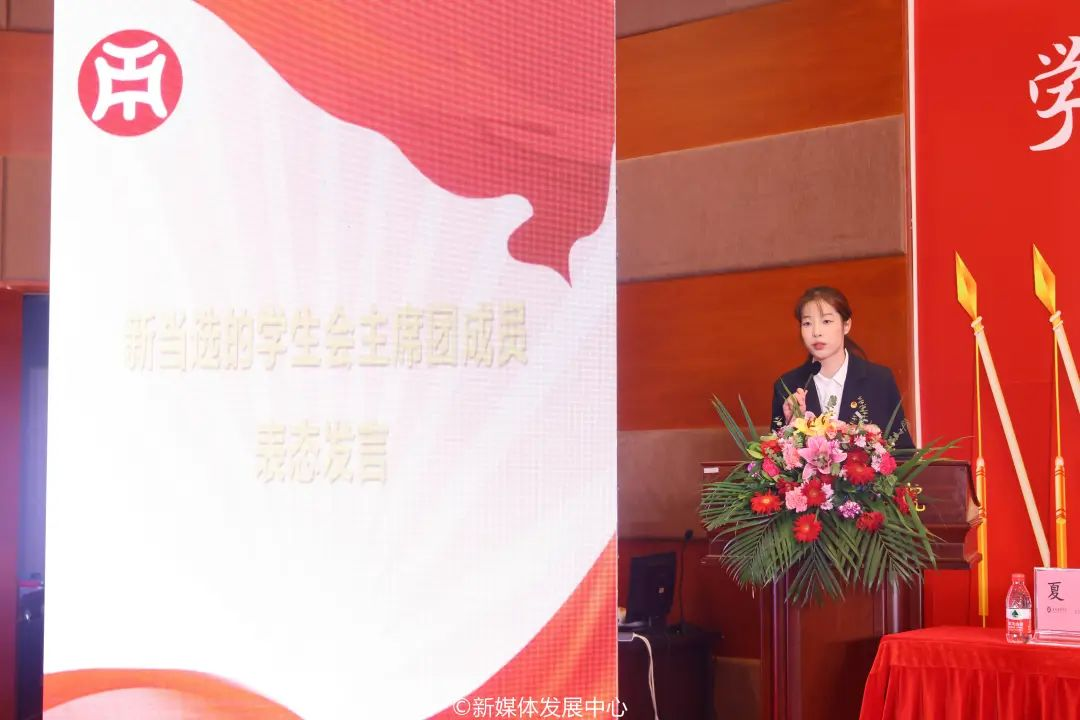 新当选主席团成员尤晓雯表态发言。tyc7111cc太阳成第三届学生会将以此为基点,全面学习宣传贯彻党的二十大精神,高举习近平中国特色社会主义思想伟大旗帜,秉承全心全意为同学服务的根本宗旨,坚定“从同学中来、到同学中去”的工作方向,努力提升学生会组织的同学满意度、大局贡献度和社会认可度,树立富有理想、关心同学、清新阳光的组织形象。