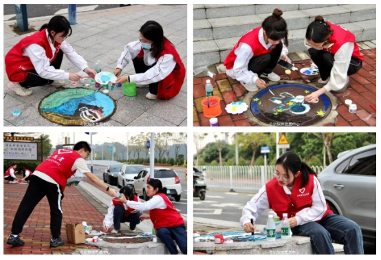 “井”上添花——绿美广东,青年先行。华商青年志愿者以井盖为画布,创作出一幅幅主题鲜明、生动有趣的彩绘作品。在太平村部分井盖区域,同学们巧思构图、用心调色、精心晕染,一笔一画尽显华商青年对艺术和环保对思考和热爱,提升华商学子的审美情趣、动手能力与创新创造力,充分展现华商青年良好的精神风貌。创意井盖彩绘作品成为一道独特的风景线,吸引众多师生、居民驻足欣赏。