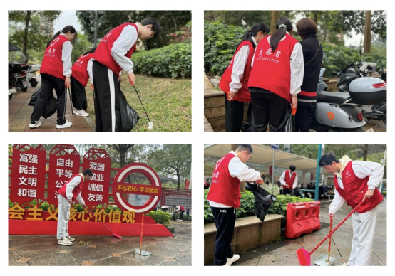 社区清扫——社区文明,实践同行。为提升金竹社区环境面貌,营造良好、舒适、美丽的生活环境,我校团委组织志愿者开展社区文明志愿服务行动。志愿者们清理社区路边落叶、垃圾,维护社区花草树木的健康成长,同时,积极向过往的居民进行保护环境的宣传,号召大家自觉维护社区环境,做好垃圾分类。