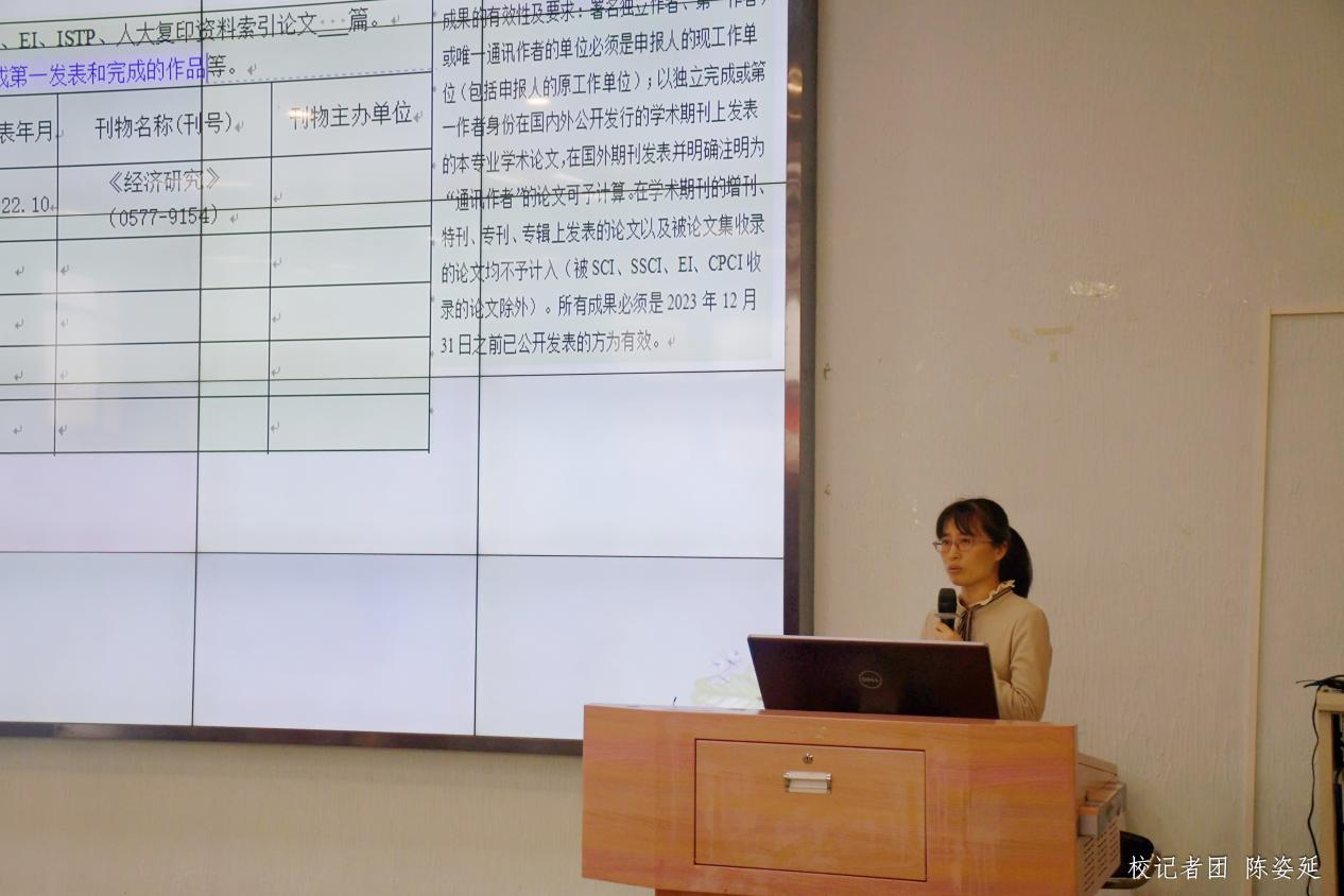 人事处副处长杨俏文从2023年职称评审文件依据、主要职称政策解读和2023年职称工作安排三个方面进行宣讲,帮助教师了解我校职称评审的相关内容,并根据上级主管单位有关职称评审的精神,结合我校职称评审文件,向与会教师详细介绍了2023年职称评审的受理范围、基本条件和业绩成果条件等内容。同时,杨俏文副处长对职称申报的各个时间节点进行了重点说明,帮助老师们更好地掌握职称评审政策,认真、规范做好职称申报工作。