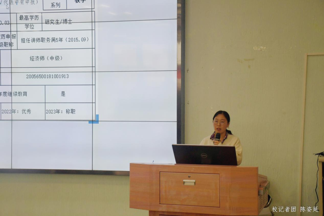 申报事项讲解环节,人事处旷美容、教务处陶丹艳、科研处孔海兰三位工作人员分别从基本信息、教学业绩情况、科研业绩情况等方面,通过举例说明、填写演示、案例展示等方式,对2023年职称申报材料填写要求及注意事项进行了详细讲解,帮助申报职称的教师进一步明晰申报要求,规范申报材料的填写,为顺利完成职称申报工作做充足的准备。