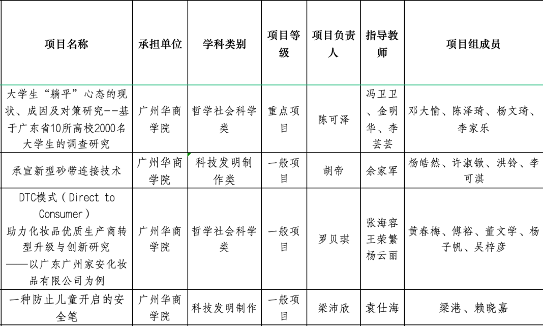 由团省委、省财政厅联合设立的2023年广东省科技创新战略专项资金(大学生“攀登计划”科技创新培育),tyc7111cc太阳成7个项目获得立项资助,其中重点项目1项、一般项目6项,共获得省财政专项资助12万元。目前,被抽中的四个项均已顺利完成校级中期检查。其中《大学生“躺平”心态的现状、成因及对策研究——基于广东省10所高校2000名大学生的调查研究》也获得第十七届“挑战杯”广东大学生课外学术科技作品竞赛省赛三等奖。《承宣新型砂带连接技术》获第十四届中国大学生服务外包创新创业大赛全国三等奖。