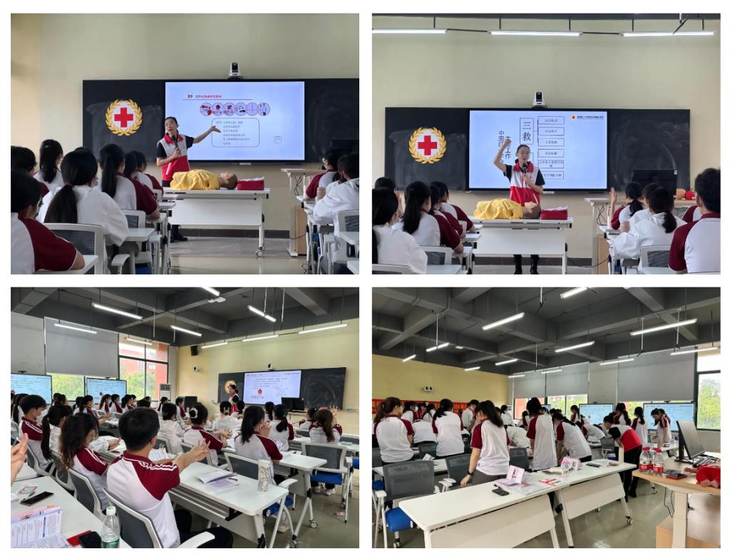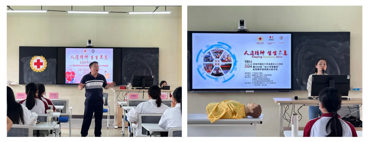 本次培训分为理论知识教学、救护模拟实操以及现场考核三个环节。其中,理论知识教学的主讲嘉宾为广州众安职业技能培训有限公司业务副总监、第16届广州市亚运会应急救护培训讲师、中国红十字会资深培训师资、广州市红十字会资深急救培训师、中国心肺复苏导师刘俐利老师。刘老师的讲座主要分为红十字运动介绍、救护概论等方面。她通过数据和演示系统为大家讲解红十字运动及我国红十字运动的历史发展、急救基本常识、心肺复苏(CPR)、自动体外除颤仪(AED)、海姆立克急救法等急救知识和方法。刘老师为同学们示范关键核心动作部分,并带领同学们现场实践。