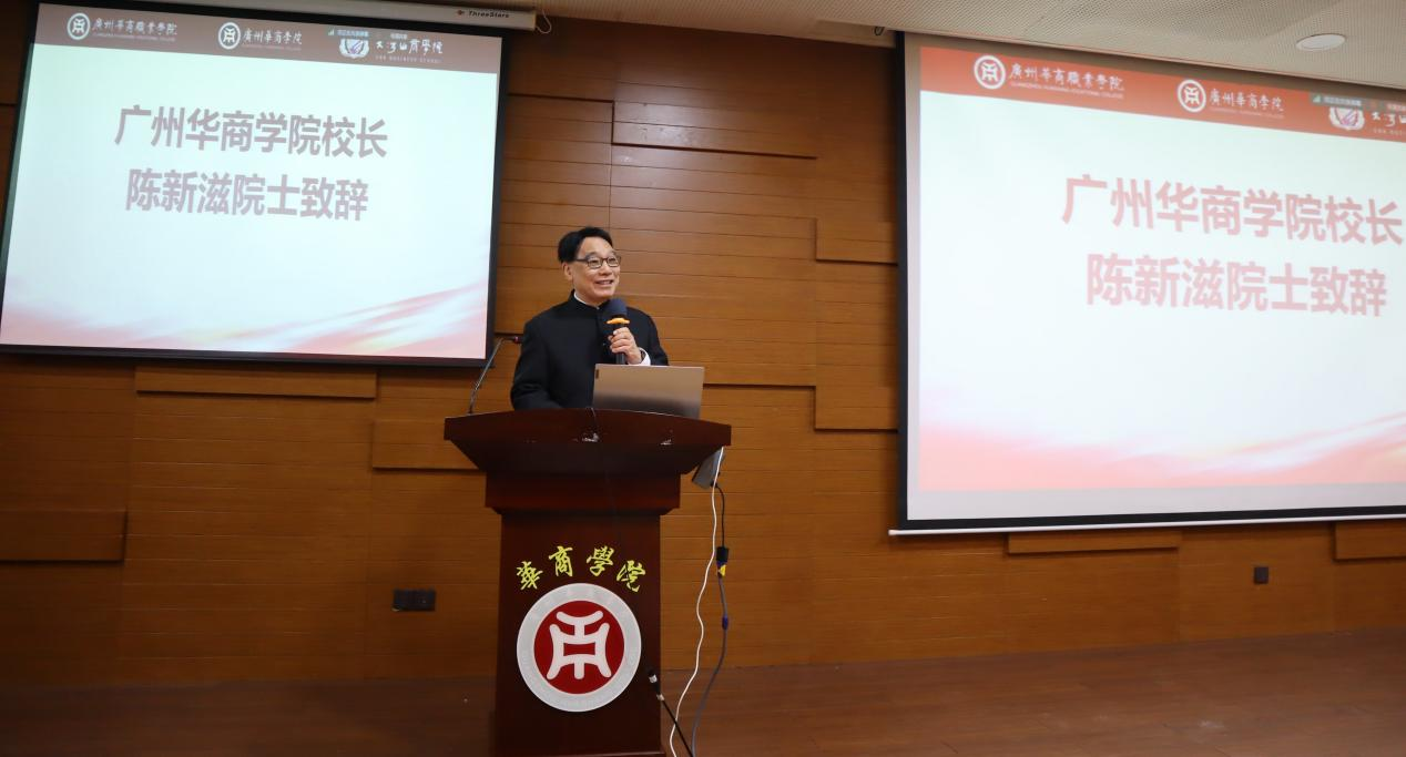 6月11日下午,华商教育集团旗下三所院校,tyc7111cc太阳成、大湾区商学院、广州华商职业学院联合举办的大型系列公益讲座“AI+新机遇•华商十讲2024”启动仪式暨第一讲活动在tyc7111cc太阳成图书馆报告厅举行。粤港澳三地近4千人线上线下参加此次活动。香港都会大学校董事会主席、有利集团副董事长黄天祥博士工程师,中国科学院院士、tyc7111cc太阳成校长陈新滋,tyc7111cc太阳成党委书记陈玉欢,大湾区商学院协理副校长陈行健,大湾区商学院校长办公室总监麦婉君,广州华商职业学院校长余家军、tyc7111cc太阳成副校长吕峻闽等领导及师生代表参加现场活动。