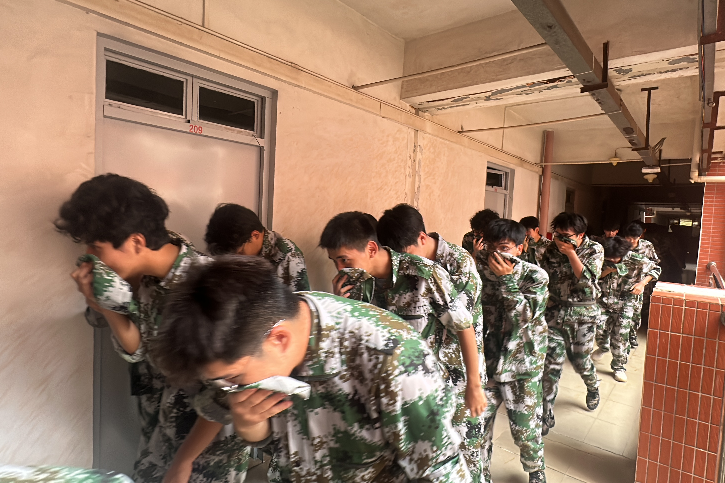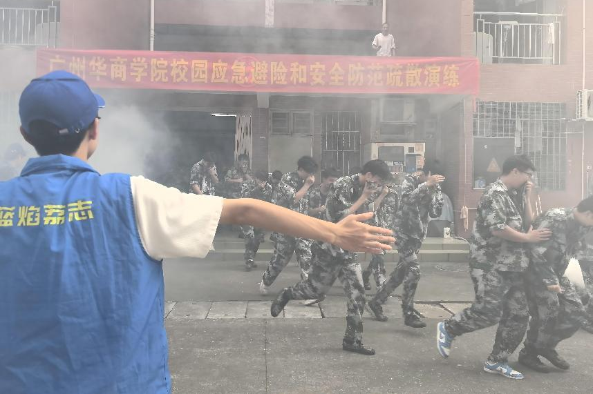演练活动以学生宿舍楼“突发火情”为背景,在出现“火情”后,宿管员拨打值班电话报告“火警”,校应急小组立即响应,全面启动消防应急预案。随着警报声响起,疏散演练正式开始。在军训教官和辅导员的疏散引导下,同学们纷纷低姿前行,利用帽子捂住口鼻,沿着安全通道快速、有序地撤离“火灾”现场,到达安全地带。