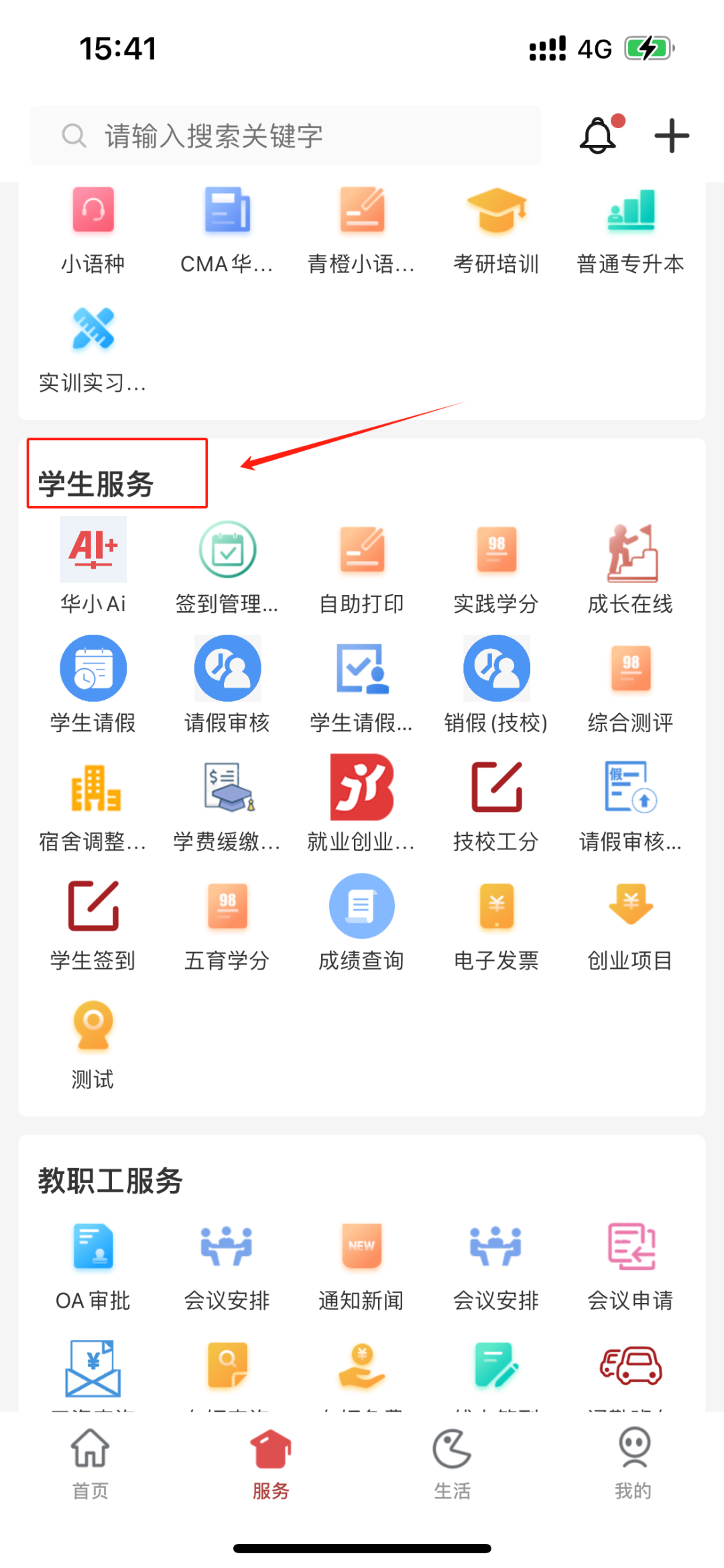 2.点击“服务”-“学生服务”板块。