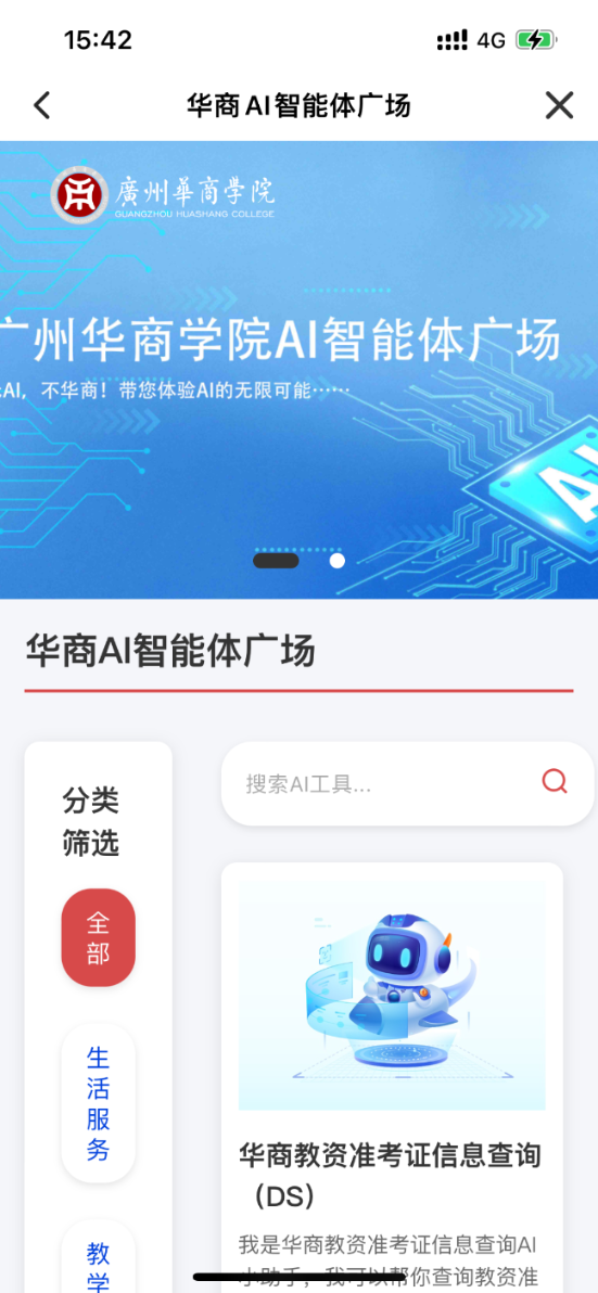为了更加方便教职工们在工作上使用,除了以上两种便利方式外,教职工们还可以通过统一门户进入【华商AI智能体广场】。