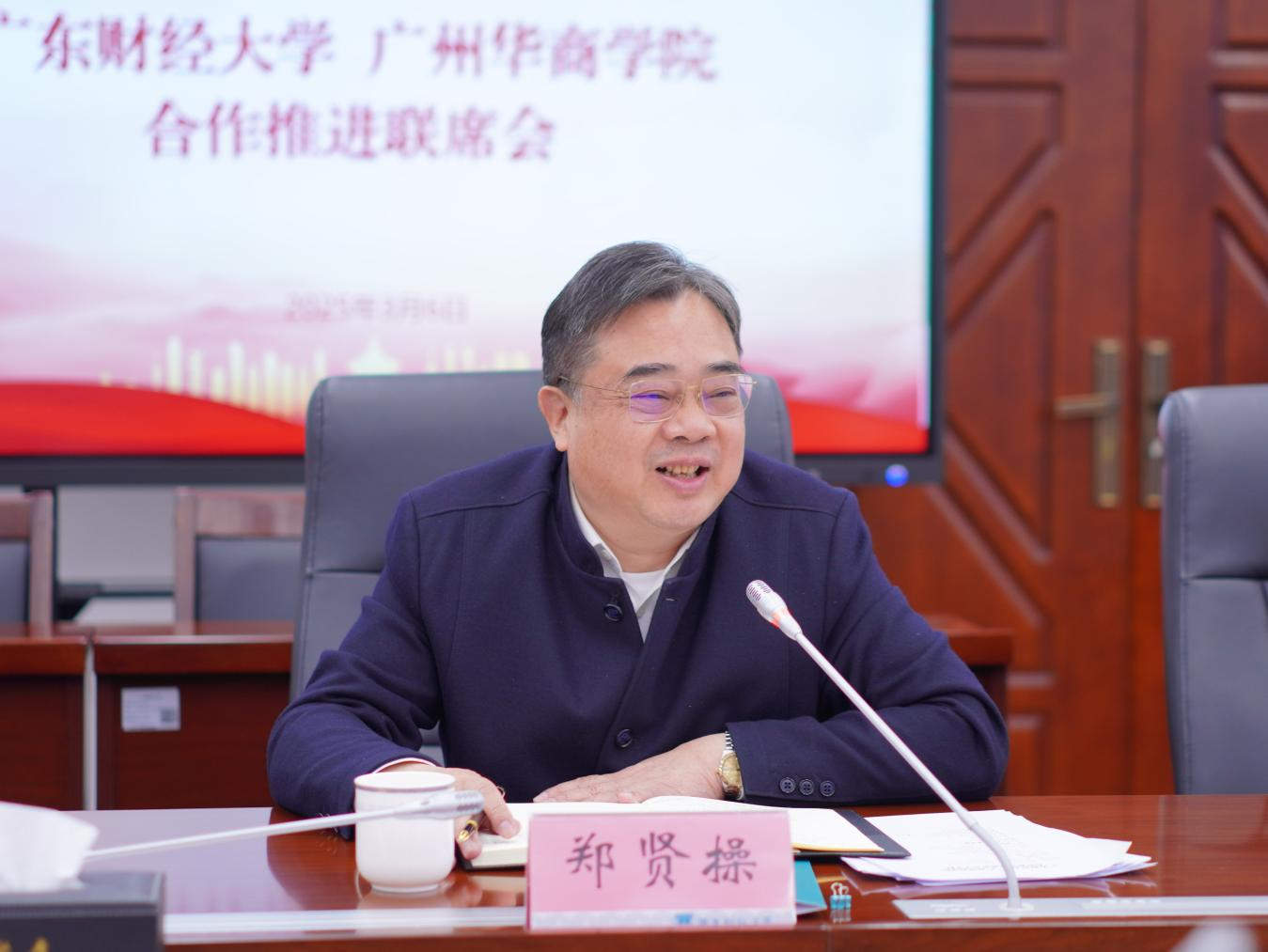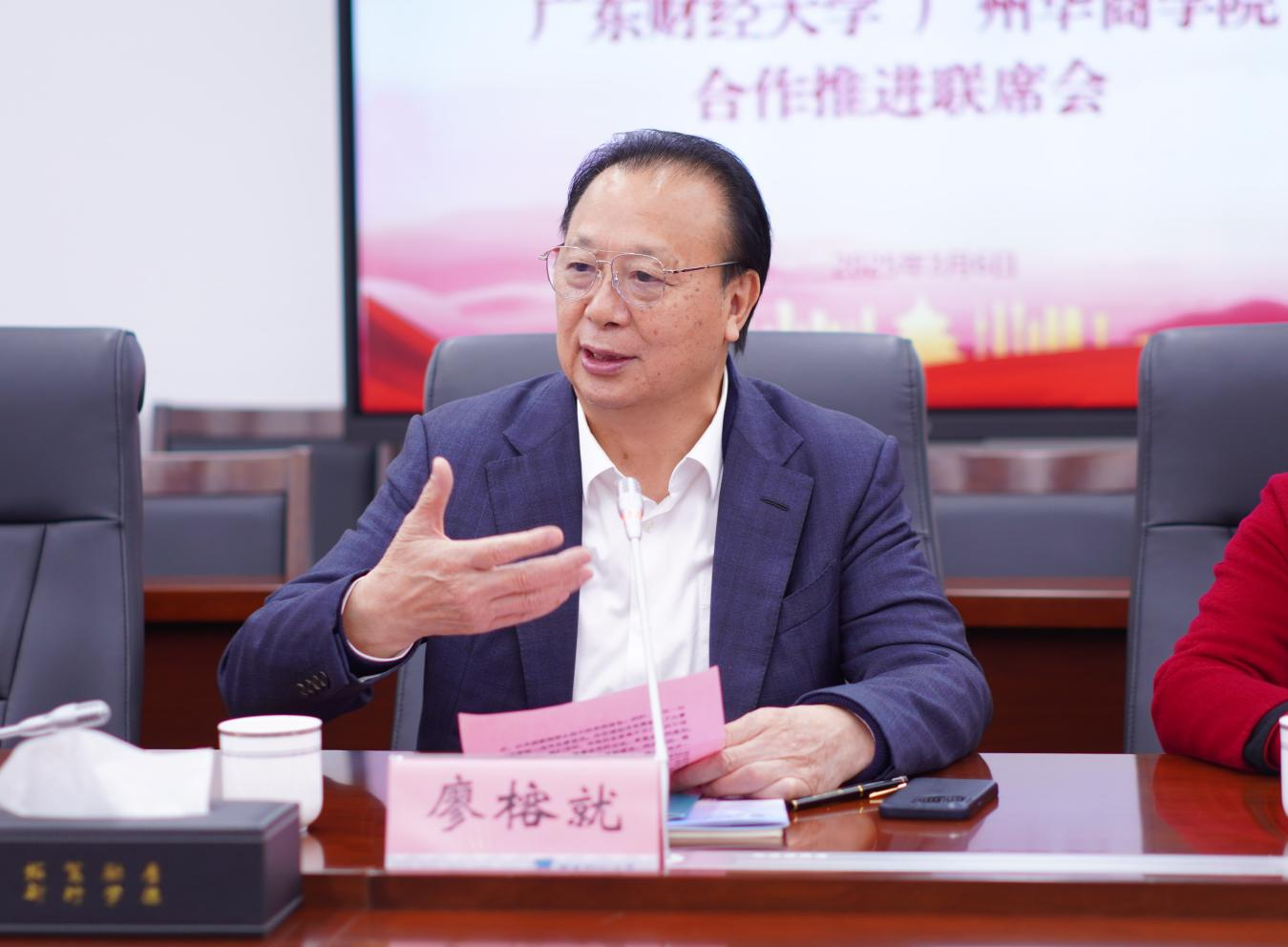 廖榕就董事长代表华商科教集团对广东财经大学这所“母体学校”长期以来的倾情相助和鼎力支持表示了最诚挚的感谢。他表示,华商学院自成立以来,就得到了广东财经大学在学科、专业、师资、科研等各方面办学资源的支持和帮助。2021年,学校转设以后,广东财经大学始终以“母体情怀”与学校开展多方面合作,这些合作的实施不仅为华商注入了高质量发展的动能,更彰显了广东财经大学的胸怀与担当。这份情谊,华商人会一直铭记于心,并将以更务实的行动回馈这份信任。此次联席会议,不仅是两校情谊的延续,更是面向未来的宣言。希望,今后与广东财经大学构建更高层次、更全方位的战略伙伴关系,携手书写湾区高等教育的崭新篇章。