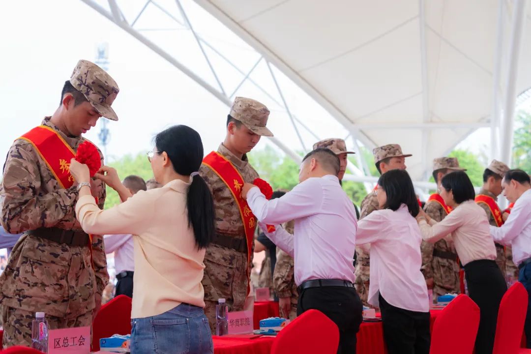 欢送大会在庄严的国歌声中拉开帷幕。增城区领导宣读了《新兵入伍命令》,并为新兵代表佩戴大红花、颁发《入伍通知书》。我校新兵下定投身军营、报效祖国的决心,展现华商学子昂扬向上的精神风貌。