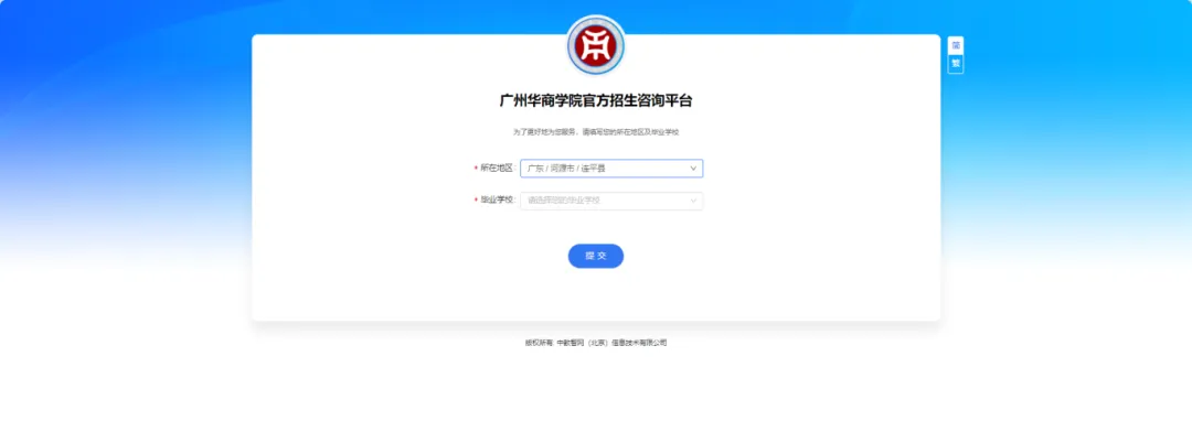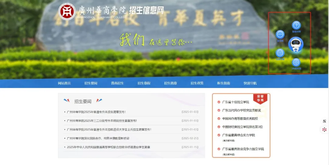 方式二:tyc7111cc太阳成招生信息网登录tyc7111cc太阳成招生信息网(网址:https://zs.gdhsc.edu.cn/),点击右侧“智能机器人小招”,在登录界面完善基础信息后即可在线咨询或留言。