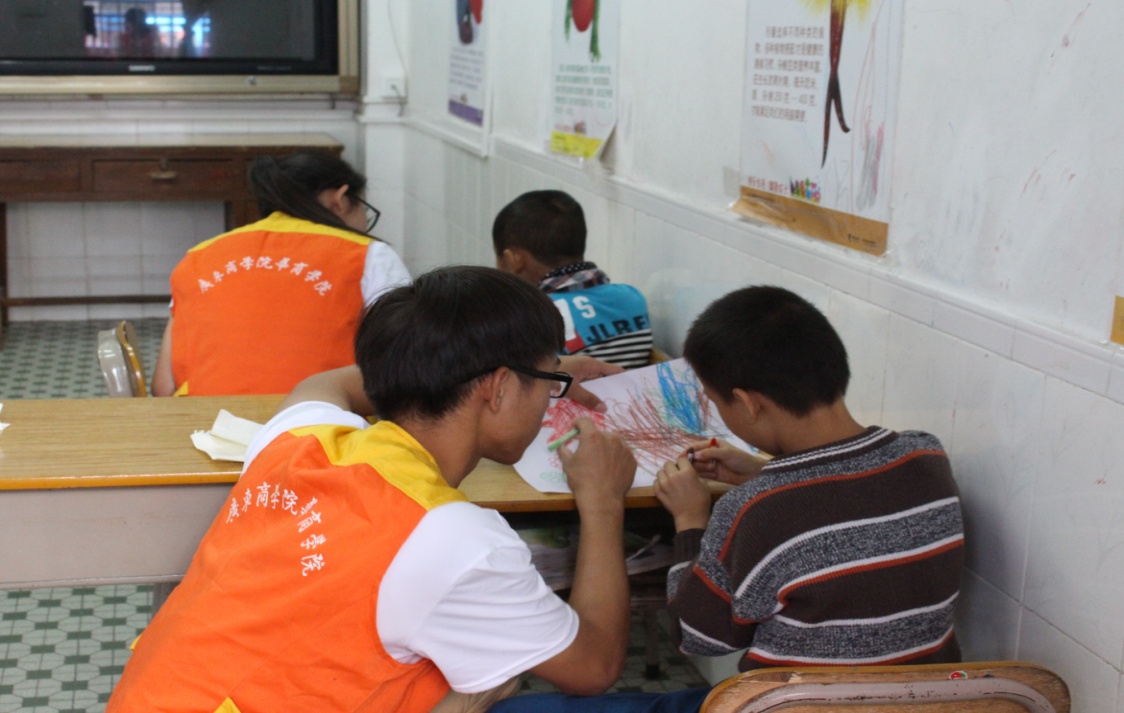 在支教过程中,我院志愿者们结合致明小学学生的特殊性,采取形式多样的活动内容,引导有言语障碍、自闭症的小朋友发出愿望,融入大伙的欢乐和笑声中,带领有智慧障碍的小朋友一起朗诵、一起游戏、一起书写,充分发挥了“奉献、友爱、互助、进步”的志愿精神。支教内容主要包括折纸教学、通过活泼有趣的动画片引导小朋友描绘自己心目中的最喜欢的小动物、引导学生学唱儿歌、与学生共同完成拼图等。整个活动过程寓教于乐,现场气氛活跃,志愿者与学生相处融洽。