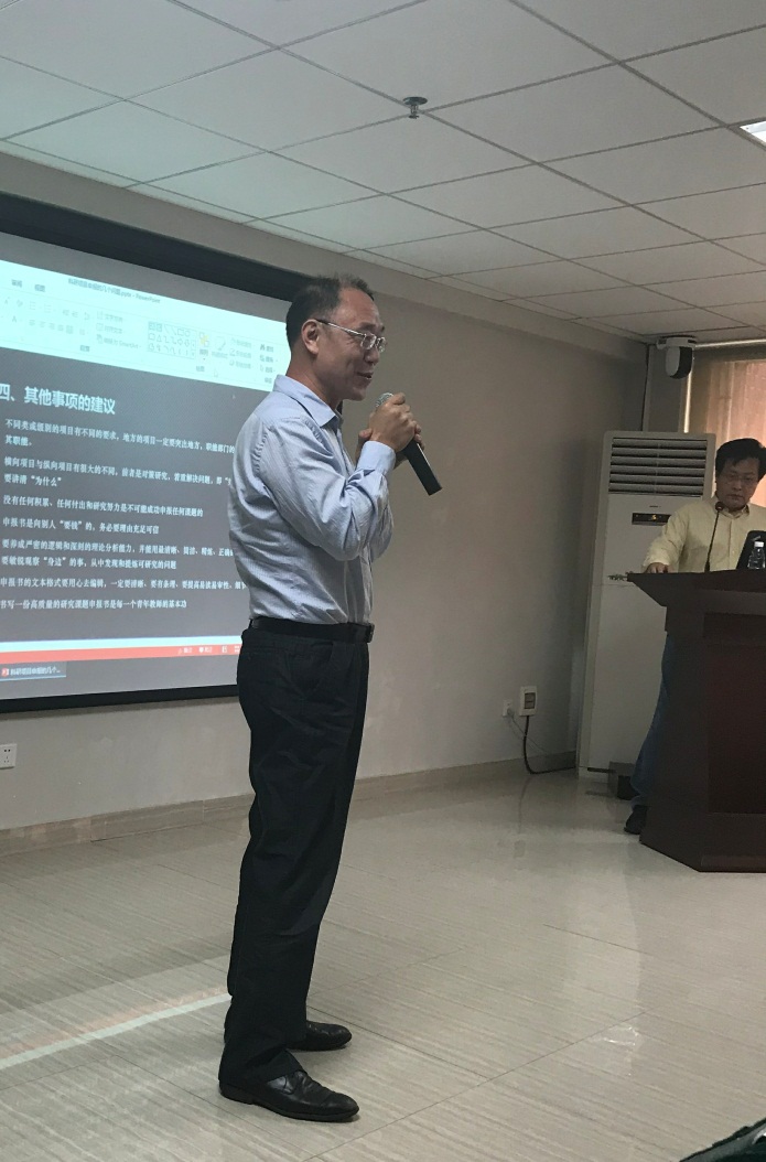 首先,科研处董处长从四个方面强调了科研项目申报书的撰写。第一,他阐述了科研项目申报书的学术内容与结构形式应该注意的问题;第二,从题目、选题、研究背景、研究方法、研究思路、预期成果和参考文献等方面强调了科研项目申报书结构形式的重要性和必要性;第三,介绍了科研项目申报书与学术论文的相同点和本质区别,特别强调了科研项目申报书中要避免出现对结论的分析与讨论等内容,重点证明其选题的重要性及值得研究的可靠性;第四,董处长从科研项目评审者的角度对撰写科研项目申报书提出了一些建议。