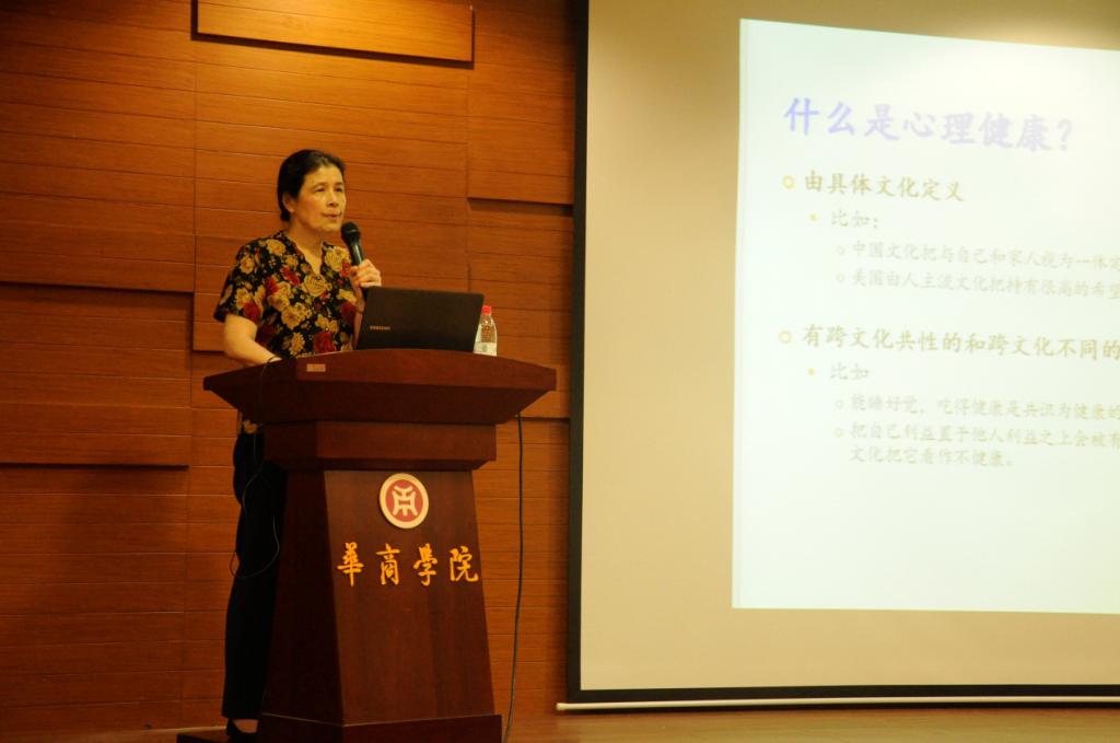 接着,段教授讲到东西方心理健康标准的不相同,美国的心理健康标准强调个人的良好感受,中国的心理健康标准更多地包含着对他人的关注。段教授指出,由于每个国家的文化和意识形态不同,所以每个国家的心理健康的标准也不同。美国民众会觉得到了十八岁还不能离开家庭独自生活是很不正常的,而在我们中国人的传统观念中,家庭是很重要的,于是到了18岁不脱离家庭是十分正常的一件事。
