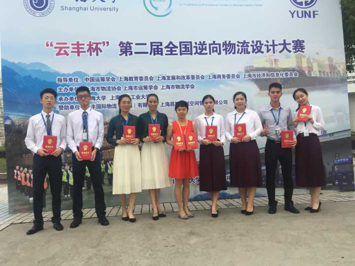 获奖师生合影 “云丰杯”第二届全国逆向物流设计大赛由上海市物流协会、上海市运筹学会、上海市物流学会主办,上海大学、上海第二工业大学承办。大本次大赛聚焦当前逆向物流发展和研究,让学生在校学习阶段能参与逆向物流运营过程,逆向物流运营调度与计划,逆向物流运营管理资源优化,帮助学生将所学知识用于解决逆向物流运营管理问题,培养和增强知识运用能力,观察思考能力,归纳分析能力,预测决策能力、协调组织能力,提高综合素质。