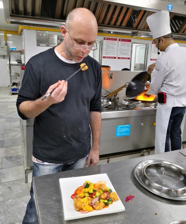 随后,在李绪彬老师的指导下,外籍教师们拿起了菜刀切肉、切菜,准备各种食材等,然后点火开锅油炸咕噜肉、炒菜、调制酱汁等。来自英国的Andrew老师第一个完成了“咕噜肉”作品,上盘后急切地品尝了他自己亲手烹饪的中国菜,在接受采访时他说了自己第一次学习中餐烹饪的感受,以及中国和英国食物的区别等。